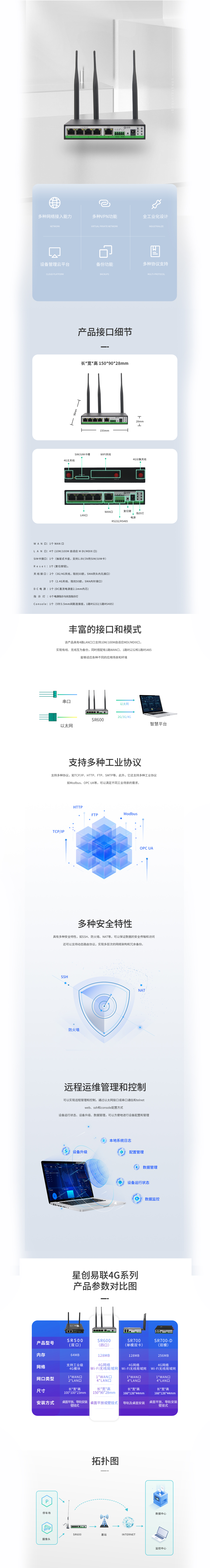 SR600是集4G网络、虚拟专用网等技术于一体的多口工业路由器。该设备凭借4G无线广域网以及Wi-Fi无线局域网等技术,提供不间断的多种网络接入能力,以其全面的安全性和无线服务等特性,为用户提供高速稳定的数据传输通道。