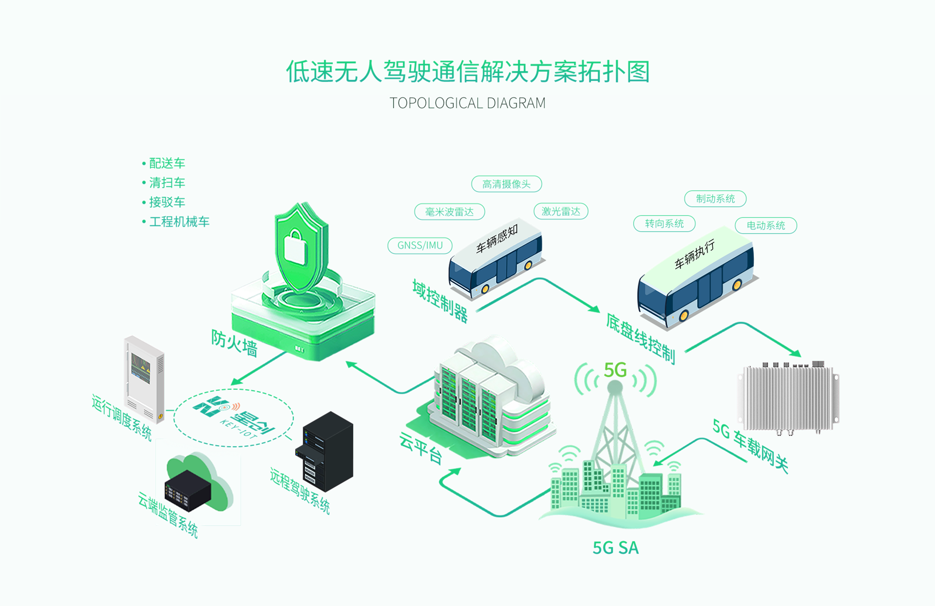 无人驾驶清扫车用于工业园区、公园、广场、景区、学校等半封闭作业区域,具有技术领先的电控系统、强大的动力系统、具备5G定位技术、百平方公里级建图能力、全局开机定位、自主识别工作环境和路径规划;高精度传感器可深度感知,实现厘米级高精度贴边行走,完美避障,扫吸合理,干湿分离,用于不同气候和环境。